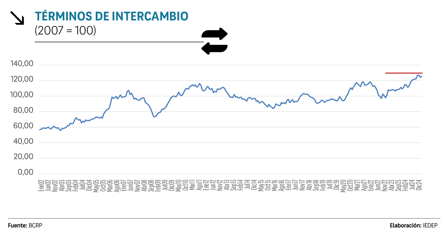 Los términos de intercambio, expresados como número índice, mostraron una tendencia al alza en los cuatro trimestres del 2024. A diciembre del año pasado, el índice alcanzó los 125,50 puntos, el nivel más alto desde el 2002, manteniéndose por encima de 100 durante 26 meses consecutivos.