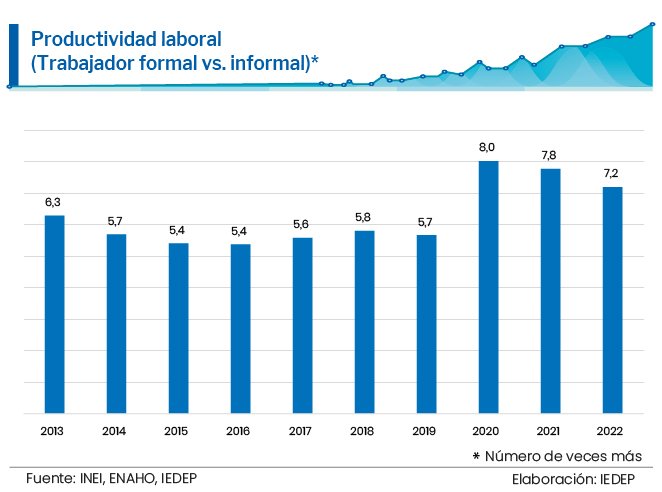 La productividad laboral promedio de un trabajador formal es 7,2 veces la correspondiente a un trabajador informal. Dicho indicador llegó a un tope de 8,0 en 2020 y viene disminuyendo paulatinamente, acercándose a su promedio histórico de 5,8.