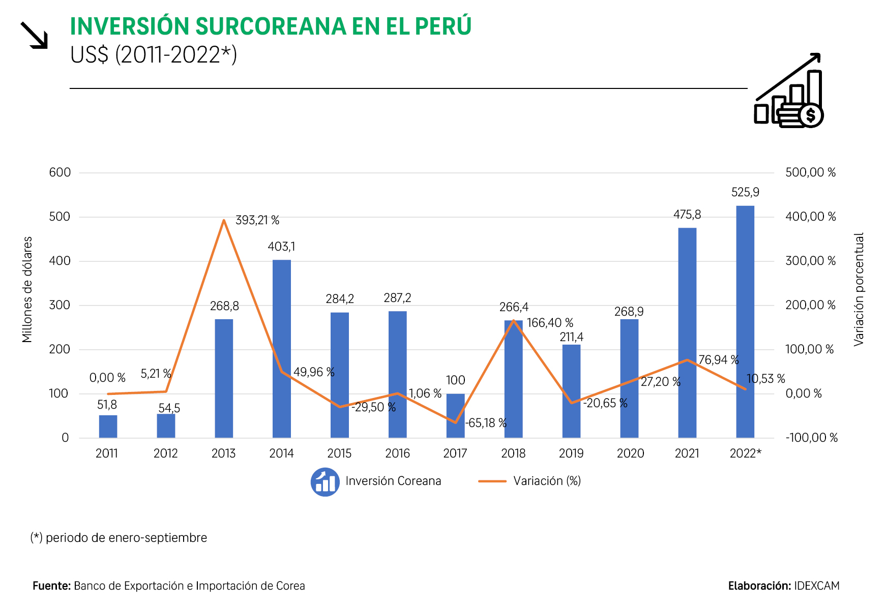 Desde el 2011, la inversión surcoreana en el país ha crecido con altibajos. Entre enero y septiembre del 2024 ascendió a US$ 525,9 millones, un incremento del 915,25 % respecto al 2011.