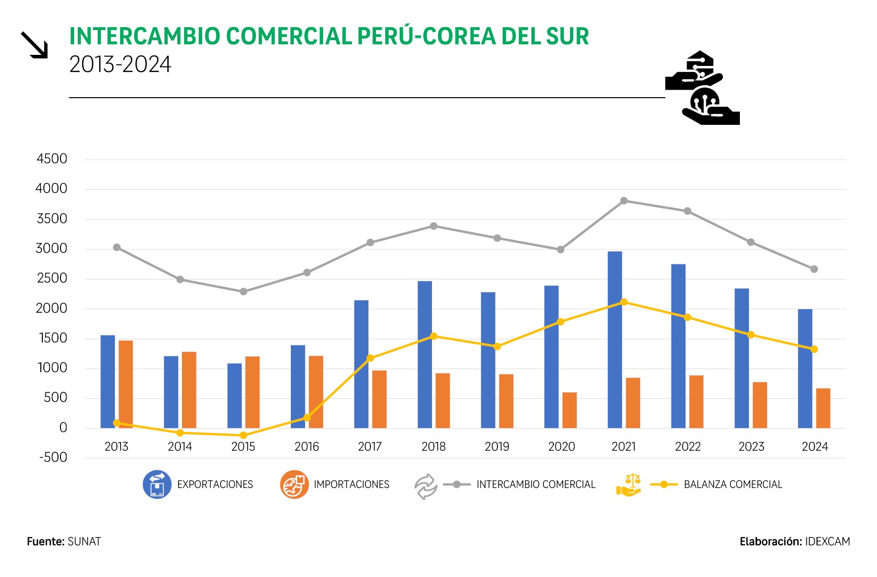 1. Desde que entró en vigencia el acuerdo entre el Perú y Corea del Sur en el 2011, el comercio bilateral se optimizó, especialmente el nivel de las exportaciones peruanas, lo que permitió pasar de un déficit a una balanza comercial favorable, sin embargo, en los últimos años el intercambio ha caído, cerrando el 2024 con una baja del 14,47 % respecto al 2023. Asimismo, es importante destacar que productos como el zinc, cobre y los mangos han mostrado buenos resultados gracias a este acuerdo.