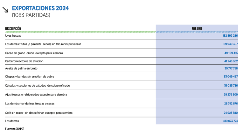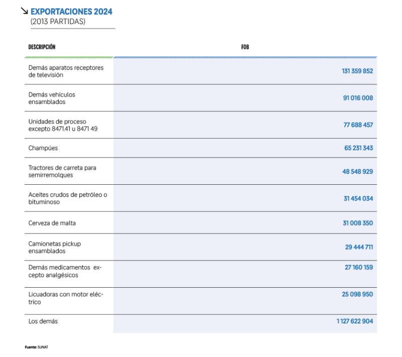 Efectuando una comparación de las 10 principales partidas exportadas en el año 2013 con respecto a las exportadas en el año 2024, sí se puede observar una mayor presencia de productos del sector agroexportador: