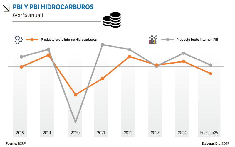 La relevancia de esta industria se refleja en el comportamiento del PBI de hidrocarburos, que en los últimos años ha mantenido una participación cercana al 1.3 % dentro de la producción nacional. Su trayectoria, sin embargo, ha sido volátil: luego de caídas profundas en 2020 y 2021, mostró cierta recuperación en 2022 y 2024, pero en el primer semestre de 2025 volvió a contraerse en –2.7 %, frente al crecimiento de 3.4 % del PBI total. Esta dinámica revela cómo la situación de Petroperú, tanto en su desempeño operativo como en su estabilidad financiera, tiene un impacto directo en el sector y repercute, en menor medida, sobre el conjunto de la economía.