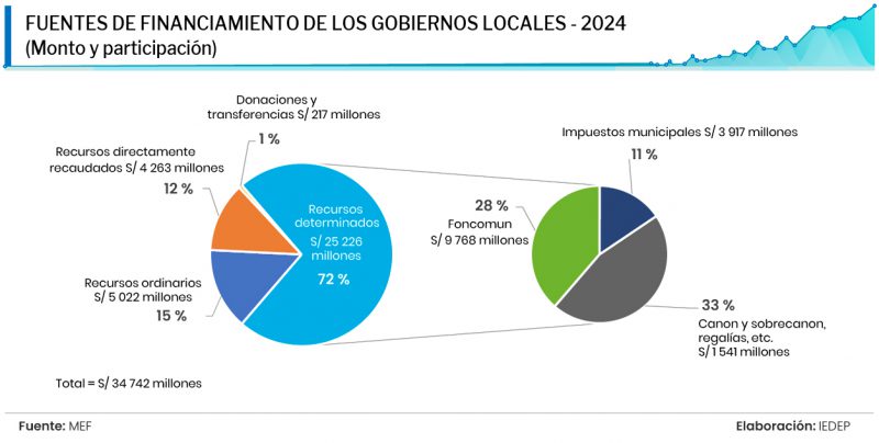 El presupuesto asignado a las municipalidades se compone de varias fuentes. El 33 % (S/ 11 541 millones) proviene del “canon, sobrecanon, regalías, rentas de aduanas y participaciones”. En esta categoría destaca el canon, definido como la participación de la que se benefician los gobiernos locales del total de ingresos y rentas que recauda el Estado por la explotación de los recursos naturales. En particular sobresalen el canon minero (S/ 4 024 millones) y el gasífero (S/ 3 251 millones).