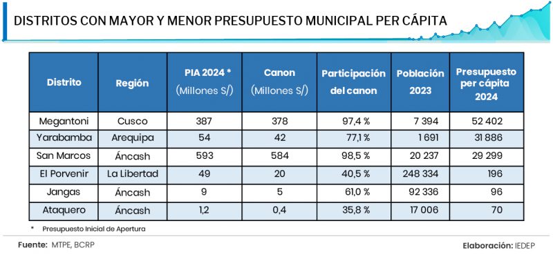 En el extremo superior, destacan los distritos de Megantoni (Cusco), Yarabamba (Arequipa) y San Marcos (Áncash), con presupuestos per cápita significativamente altos, debido en gran parte a los recursos mineros y gasíferos. Por otro lado, en el extremo inferior se encuentran distritos como El Porvenir (La Libertad), y Jangas y Ataquero, ubicados en Áncash.