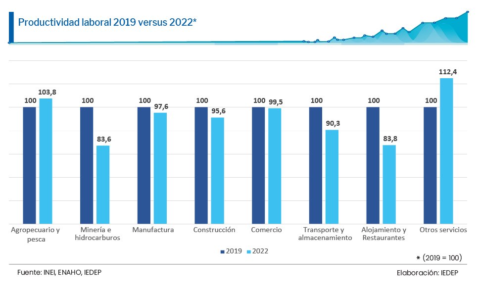 Entre 2022 y 2019, la productividad laboral registró retrocesos en seis de ocho actividades económicas que componen el PBI, los que aún no logran superar el nivel prepandemia. Estos son Minería e Hidrocarburos (-16,4 %), Manufactura (-2,4 %), Construcción (-4,4 %), Comercio (-0,5 %), Transporte y Almacenamiento (-9,7 %) y Alojamiento y Restaurantes (-16,2 %).