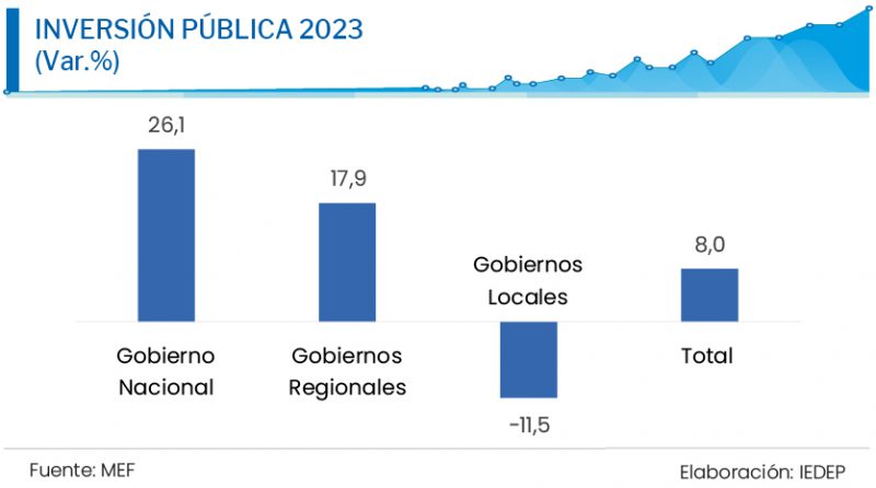 Con relación al gasto de inversión pública se requiere asegurar los S/ 61 301 millones asignados, que representan casi el 6 % del PBI. Para ello se necesita que los gobiernos subnacionales sigan recibiendo capacitación y asistencia técnica en los sistemas administrativos (Invierte.pe, Presupuesto Público, etc.) por parte del Ministerio de Economía y Finanza (MEF) a través del Conectamef. Este servicio trajo buenos resultados en 2023, ya que la inversión de los gobiernos regionales (GORE) aumentó pese a que fue el primer año de gestión de sus nuevas autoridades.