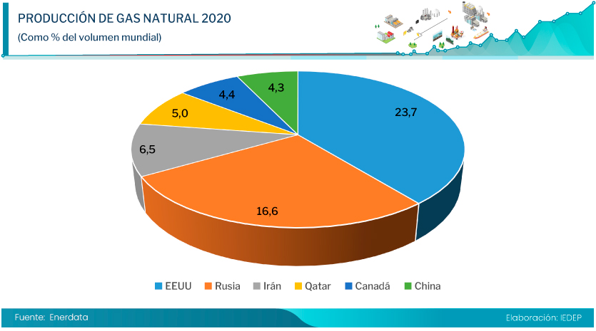 En 2020 destacaron como principales productores Estados Unidos, con el 23,7% del mercado global, Rusia (16,6%), Irán (6,5%), Qatar (5%), Canadá (4,4%) y China (4,3%), países que en conjunto representaron el 60% de la producción mundial.