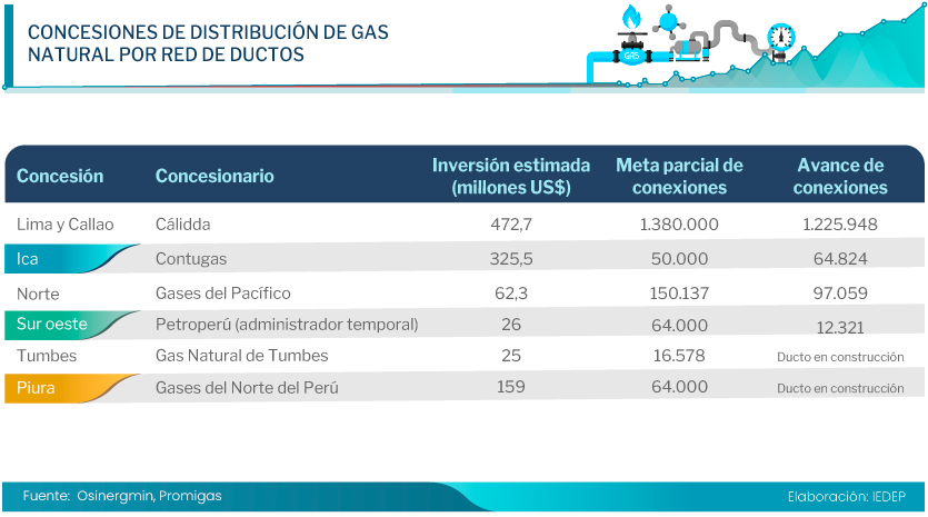 Finalmente, la distribución en Piura se adjudicó en 2019 a solicitud de parte por un periodo de 32 años a la empresa Gases del Norte del Perú S.A.C., la que, con una inversión estimada en US$ 159 millones, se comprometió a conectar a 64.000 clientes residenciales durante el periodo 2022-2030. A la fecha, los ductos están en etapa constructiva.