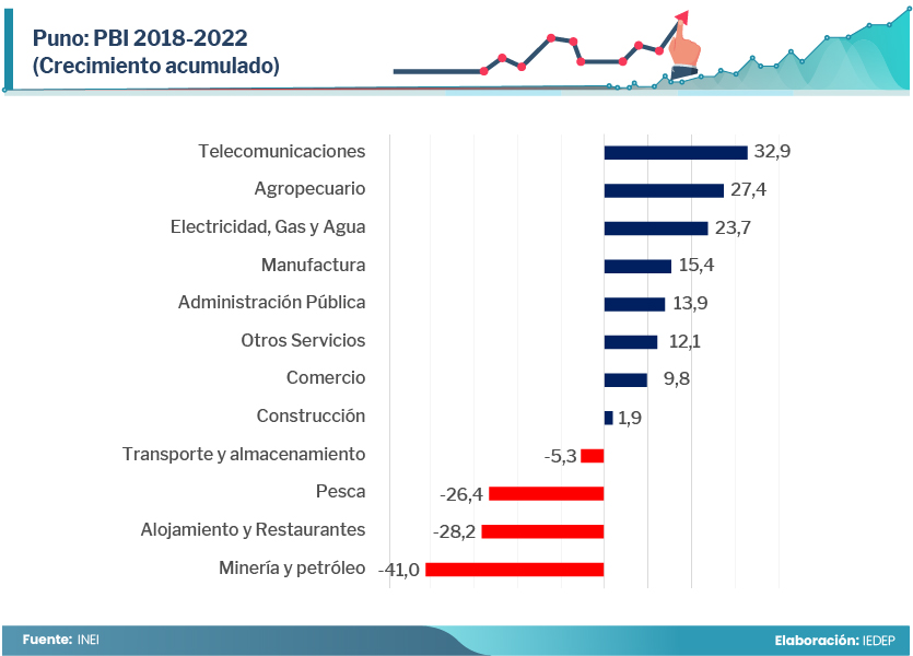 La región Puno aportó en los últimos quince años un promedio del 2% del PBI nacional, además de registrar un crecimiento de alrededor del 3,7% anual. En 2022, el PBI de Puno alcanzó una expansión de 3,3%, por encima del promedio nacional (2,7%) y logró un crecimiento acumulado del 70% con respecto al año 2007.