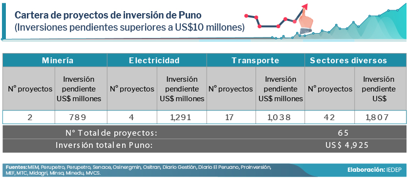 Según la Cartera de Proyectos de Inversión (CPI) edición 2023, elaborada por el IEDEP, Puno cuenta con un total de 65 proyectos por un valor superior a US$ 4.925 millones presentes en casi la totalidad de sectores económicos con la excepción de hidrocarburos. La CPI 2023 incluye, además, más de 1.300 megaproyectos de infraestructura pública y privada cuya inversión individual pendiente superaría los US$ 10 millones a desarrollarse en los próximos años.