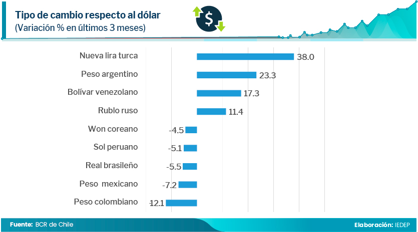 En los últimos tres meses, diversas monedas se han apreciado respecto al dólar, tales como el real brasileño (-5,5 %), peso colombiano (-12,1 %), won coreano (-4,5 %), peso mexicano (-7,2 %) y el sol peruano (-5,1 %). En cambio, otras monedas han perdido valor frente a la divisa estadounidense, tales como el peso argentino (23,3 %), rublo ruso (11,4 %), la nueva lira turca (38 %) y el bolívar venezolano (17,3 %).