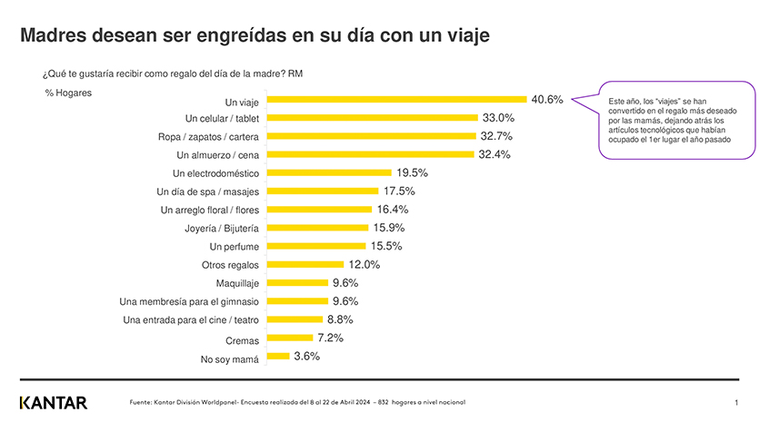 La consultora Kantar División Worldpanel Perú realizó el estudio para conocer cuáles son los regalos más anhelados por las madres peruanas este año, tanto en Lima como en regiones. La encuesta reveló que los viajes son la opción favorita (40.6 % de las preferencias), seguidos por los artículos tecnológicos como tablets y celulares en el segundo lugar (33 %). Esta tendencia marca un cambio con respecto al año pasado, cuando los regalos tecnológicos fueron la primera elección de las mamás.