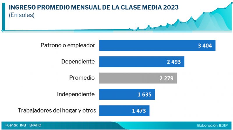 Con respecto a la relación laboral que poseen los trabajadores de clase media, el 62,1 % son dependientes, 27,2 % son independientes, 5,7 % son empleadores y 5 % son trabajadores del hogar u otros. Esta estructura influye considerablemente en el ingreso promedio de la clase media, que es de S/ 2 279 mensuales, ya que es elevada por el ingreso promedio de los dependientes (S/ 2 493 mensuales) y de los empleadores (S/ 3 404 por mes).