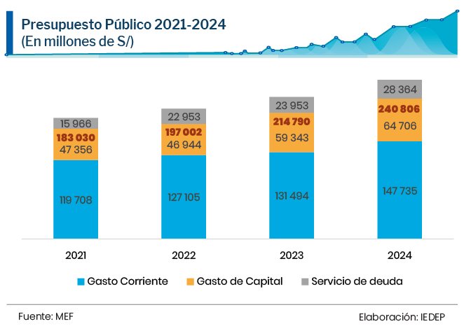 El PP2024 asciende a S/240 806 millones, equivalente al 22,4 % del PBI con un incremento de 12,1 % con respecto al correspondiente del 2023. Ha sido elaborado bajo supuestos como un crecimiento del 3 % y una tasa de inflación del 3 % anual. Si bien los supuestos son referenciales y no determinantes para la ejecución del presupuesto, es necesario mencionar que, al menos para el 2024, será difícil alcanzar ambas proyecciones. Se podría lograr un crecimiento del 3 % si, en lo que queda del presente año, la economía no llega ni al 1,1 % proyectado por el MEF y el objetivo de la inflación queda supeditado a la intensidad del fenómeno de El Niño.
