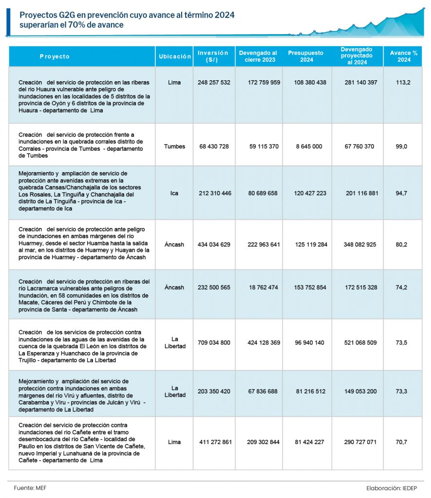 El Instituto de Economía y Desarrollo Empresarial (IEDEP) ha detectado 22 proyectos de prevención de riesgos bajo la modalidad G2G distribuidos en ocho regiones, cuyos costos de inversión alcanzan los S/ 7 326 millones. Para el filtro de selección se consideraron aquellos proyectos cuya inversión pendiente superan los S/ 39 000 000