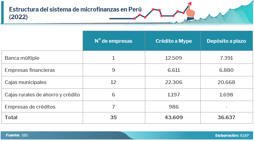 Al 31 de diciembre del 2022, el total de créditos mypes otorgado por las IMF ascendió a S/ 43.609 millones, lo que equivale al 4,6% del PBI. Las CM concentran el 51,1% de los créditos totales, seguido por la única entidad bancaria especializada en microfinanzas, Mibanco, que tiene una participación del 28,7%. Luego, siguen en importancia, las EF con 15,2%; y las CR y las EC con 2,7 y 2,3%, respectivamente.