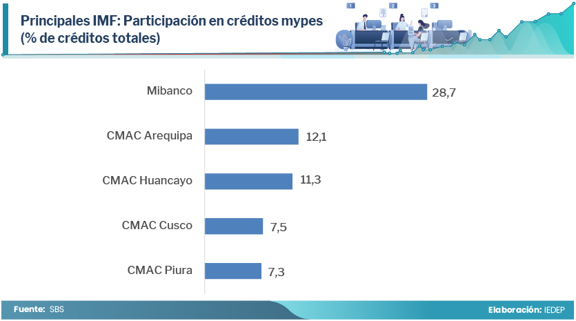 Cinco instituciones microfinancieras concentran el 68,7% del total de créditos otorgados a las mypes. Mibanco lidera el mercado con una participación del 28,7% del total de créditos mypes. Le siguen en importancia CM Arequipa (12,1%), CM Huancayo (11,3%), CM Cusco (7,5%) y CM Piura (7,3%).