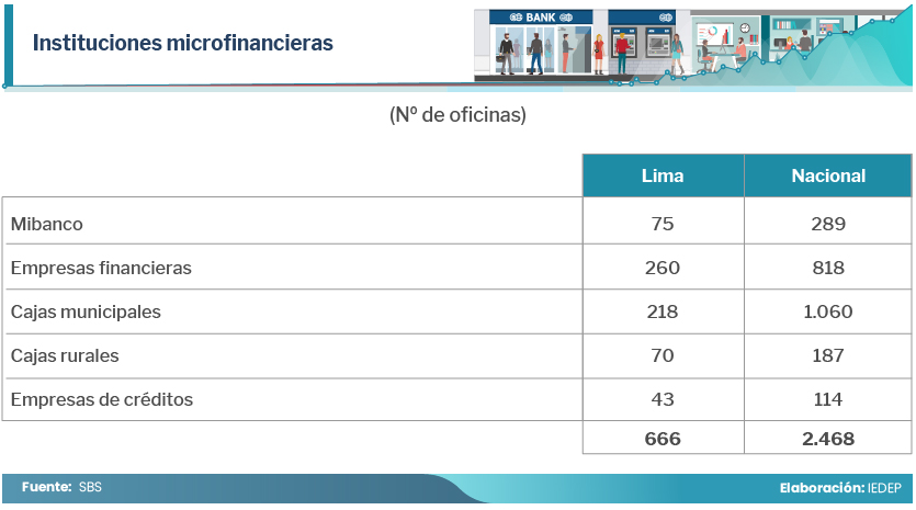 Las instituciones microfinancieras se caracterizan por cubrir todo el territorio nacional, complementándose con la banca múltiple. Tienen un total de 2.468 oficinas a nivel nacional, de las cuales 666 se ubican en Lima y 1.802 restantes en provincias. Son las EF las que cuentan con un mayor número de oficinas en Lima (260), seguidas de las CM (218); mientras que en provincias son las CM (1.060) las que superan a las EF (818), CR (187) y ED (114). En el caso del líder del mercado, Mibanco, cuenta con 75 oficinas en Lima y 289 en el resto del territorio nacional.