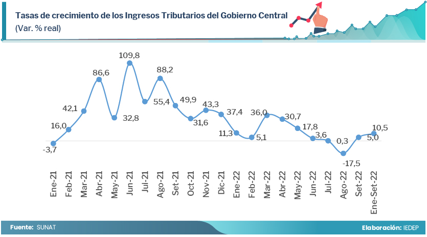 Por otro lado, el rubro Construcción registró una caída de 8,5% en el mes de setiembre y de 2,3% en términos acumulados de enero a setiembre, siendo el único sector con tasa negativa. Esto se entiende porque dicho sector fue el de mayor crecimiento durante el 2021, con una tasa de 35,5%, y con un incremento en la recaudación del 45,1%.