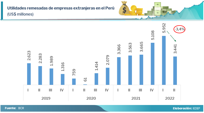 Hay que advertir que la coyuntura internacional de menores precios de metales, como el cobre, plata y zinc, viene reduciendo las utilidades de empresas extranjeras en el Perú. Así, las utilidades remesadas al extranjero pasaron de registrar US$ 5.952 millones el primer trimestre de 2022 a US$3.441 millones durante el segundo trimestre.