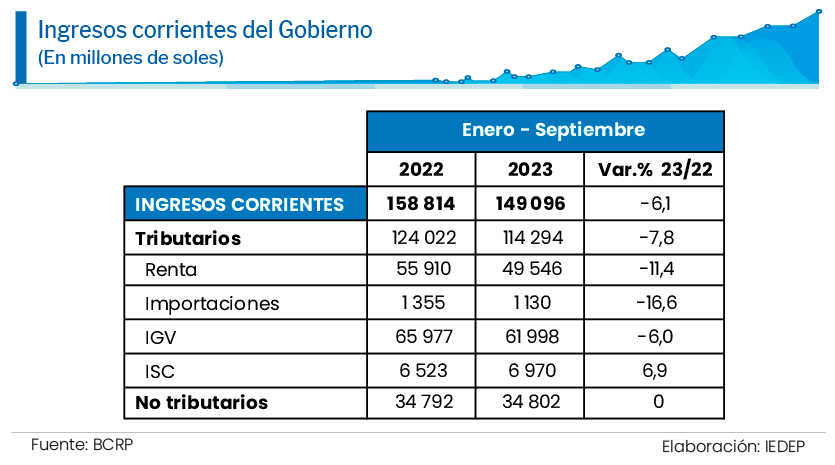 Este enfriamiento económico se traduce en una reducción de la capacidad de recaudación fiscal. Los ingresos tributarios han disminuido del 17,2 % al 15,4 % del PBI entre enero y septiembre de este año. En paralelo, los ingresos corrientes también se han reducido, al pasar del 22 % al 20 % del PBI en el mismo periodo.