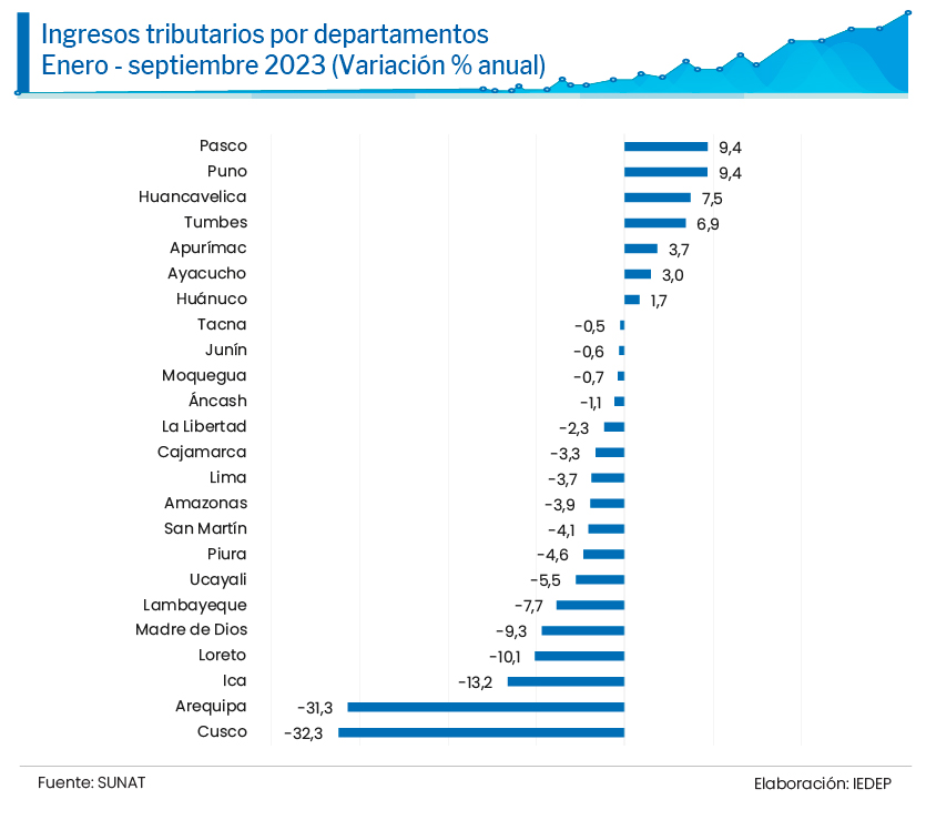 La información del Instituto Nacional de Estadística e Informática (INEI) muestra que 12 departamentos se encuentran en “recesión técnica”, es decir, con una caída de su PBI por dos trimestres consecutivos, resultados que se reflejan en la recaudación. Según la Superintendencia de Aduanas y de Administración Tributaria (Sunat), los ingresos tributarios internos por departamentos han caído en 5,3 %, considerando el mismo periodo de análisis. La caída en la recaudación es muy marcada en departamentos como Cusco (-32,3 %), Arequipa (-31,3 %), Ica (-13,2 %) y Loreto (-10,1 %). Lima, que aporta el 86,5 % de la recaudación total, cayó en 3,7 %.