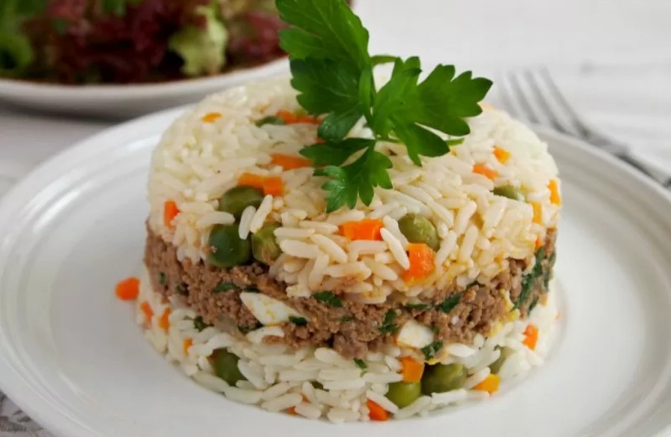 • En un plato hondo colocar una capa de arroz, luego de relleno de carne y terminar con otra de arroz. Presionar bien. Voltear en un plato, decorar con perejil, huevo, pimentón y servir.