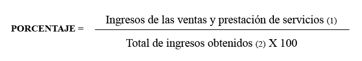 El porcentaje es el resultado de dividir los ingresos que corresponden a la venta y prestación de servicios de las actividades sujetas a la tasa especial del IGV, entre el total de ingresos obtenidos por la mype multiplicado por 100.