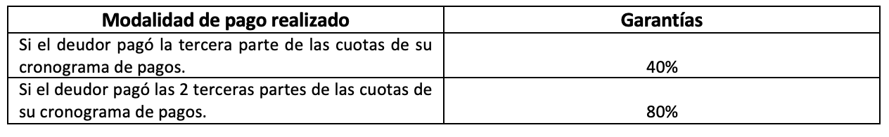 Para los créditos hipotecarios para vivienda, la garantía cubre el 50% de la porción pendiente del capital correspondiente al segundo tercio de las cuotas reprogramadas, siempre que el deudor haya pagado el primer tercio de las cuotas reprogramadas.