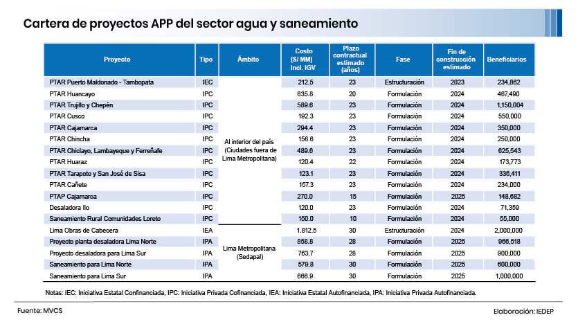 Respecto al avance de los proyectos, Proinversión informa en su Portafolio de Proyectos de noviembre 2021 que las obras con hitos de adjudicación son la PTAR Puerto Maldonado y Lima obras de cabecera para el primer y tercer trimestre de 2022, respectivamente. En tanto, las obras con declaratoria de interés son las PTAR Huancayo y Chincha para el tercer y cuarto trimestre de 2022, respectivamente. Por su parte, se consideran proyectos en maduración las PTAR Trujillo, Cajamarca, Cañete, Cusco, Tarapoto, Saneamiento Rural Loreto, Desaladoras Ilo y Lambayeque.