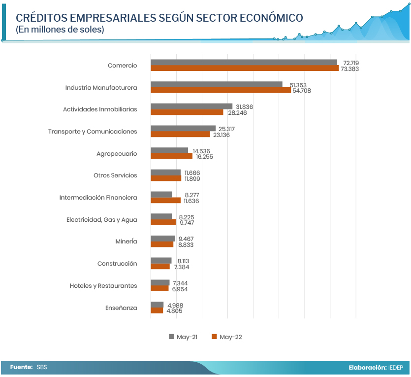 Según los datos de la Superintendencia de Banca, Seguros y AFP (SBS), el sector Comercio captó créditos por S/ 73.383 millones, lo que representa el 27,6% del total. Le siguen el sector Manufactura, con S/ 54.708 millones (20,6%); y Actividades inmobiliarias, con S/ 28.246 millones (10,6%). En conjunto, estos tres sectores canalizan el 59 % de los créditos otorgados al rubro empresarial.
