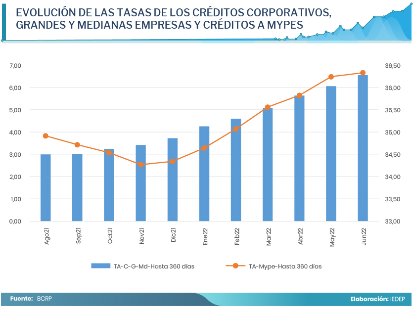 Sin embargo, entre agosto del 2021 y junio del 2022, periodo en el que se realizaron los incrementos de la tasa de referencia, se observó en la Banca Múltiple que la tasa de interés activa de los créditos corporativos grandes y medianas empresas de corto plazo son las más afectados y las que absorben rápidamente los incrementos pasando de 2,99% a 6,55%, lo que significa un alza 3,56 puntos porcentuales en 11 meses.