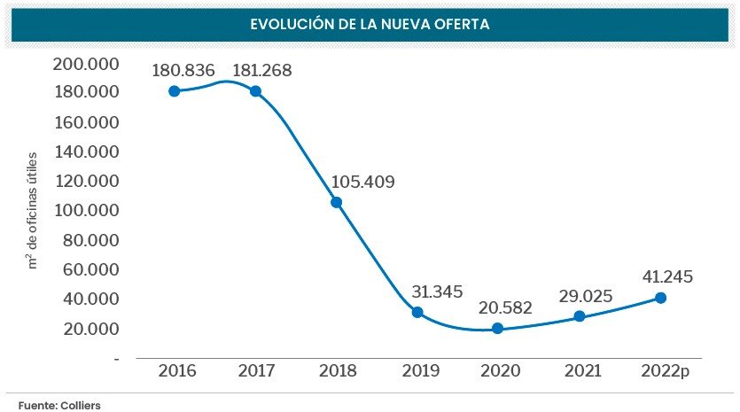 “En el mercado de oficinas prime, la ocupación o absorción en lo que va del 2022 es positiva por primera vez desde el 2019 (en 2020 y 2021 se registró una absorción negativa, de -9.200m2 y -38.500m2, respectivamente)”, puntualiza.