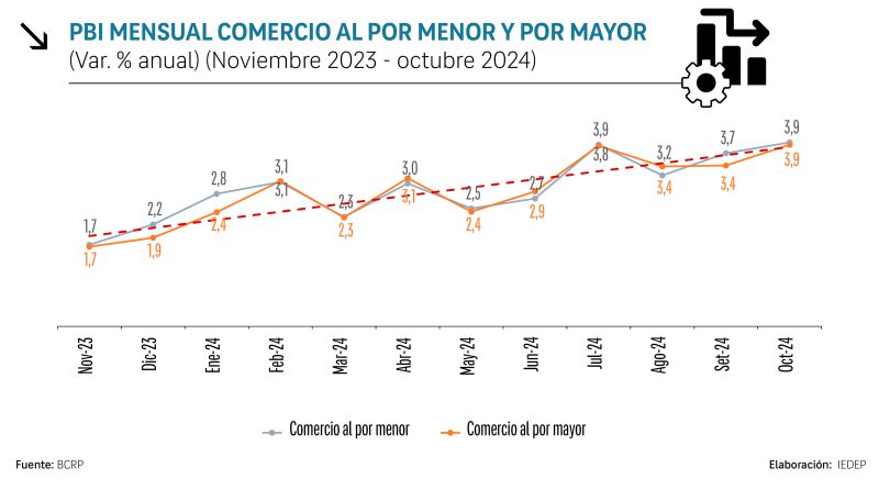 El sector Comercio (mayorista y minorista) ha mantenido una tendencia de crecimiento sostenido desde marzo del 2021. Aunque en enero del 2024 el crecimiento fue de 2,4 % versus el mismo periodo del año anterior, los meses siguientes registraron un mejor desempeño, alcanzando un máximo de 3,8 % en octubre. Este progreso está respaldado por una recuperación gradual de la demanda y un entorno económico más favorable, lo que anticipa un crecimiento continuo para el 2025.