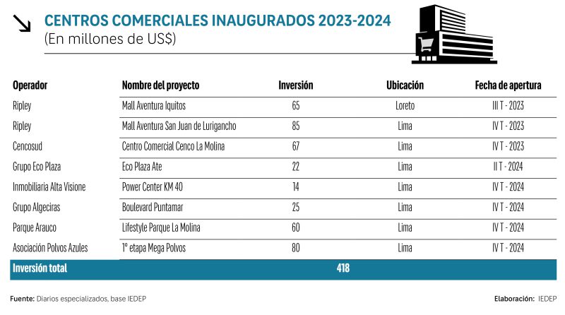 En el 2024, se inauguraron cinco centros comerciales, con una inversión conjunta de US$ 201 millones (cifra menor a los US$ 213 millones invertidos en los tres centros comerciales inaugurados en el país en el 2023), con los que el número de malls en el Perú suman 110. Entre los nuevos centros comerciales más destacados figuran: