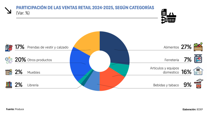 La categoría de alimentos concentró la mayor proporción de la facturación, con una participación del 27 % (equivalente a S/ 2 098 millones en promedio), reflejando la alta rotación de productos de consumo masivo durante la temporada festiva. Le siguieron otros productos, con una participación del 20 % (S/ 1 605 millones), y prendas de vestir y calzado, que representaron el 17 % de las ventas (S/ 1 309 millones) impulsados por las preferencias de moda y las preferencias de esta categoría para regalos.