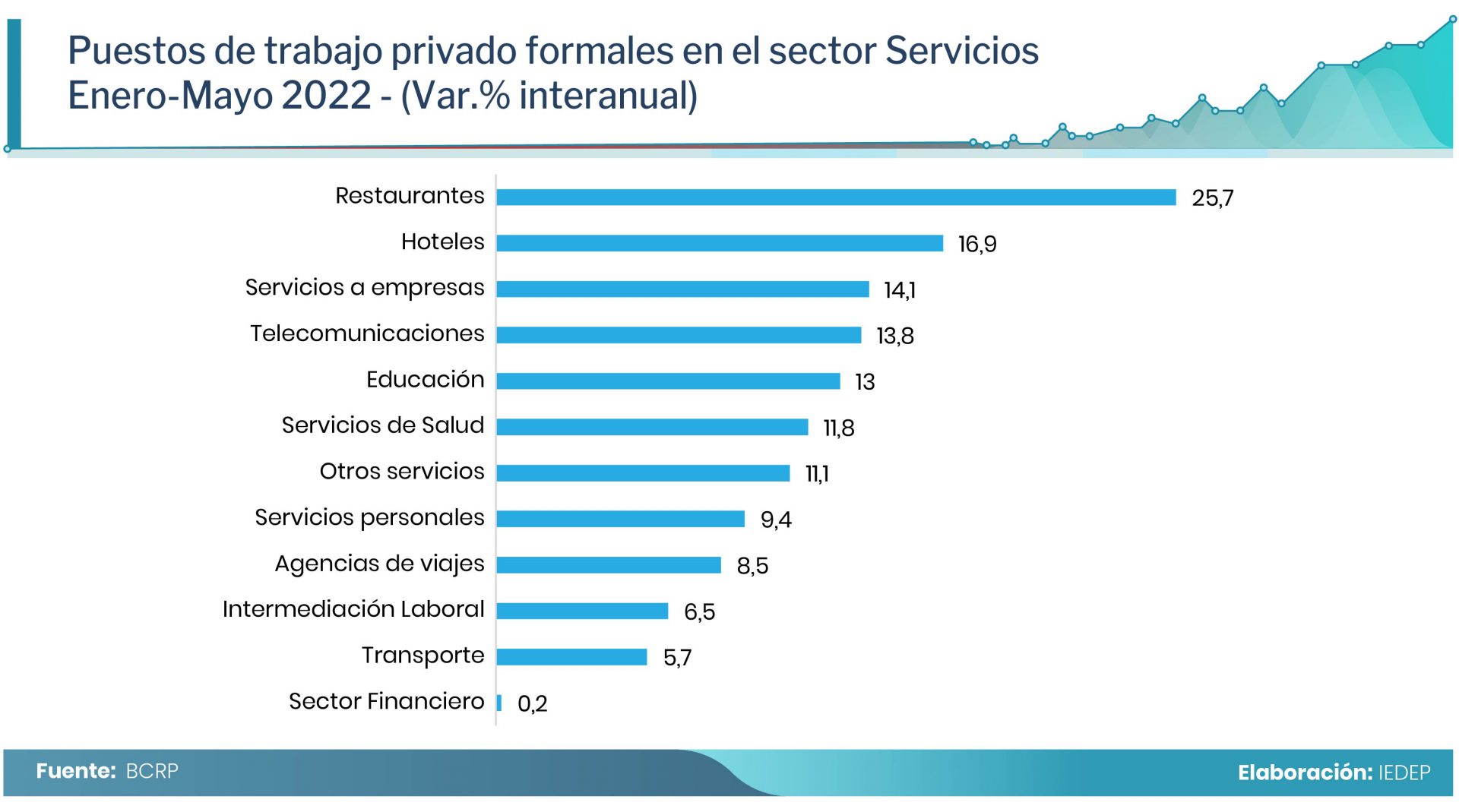 Entre enero y mayo de 2022, el PBI del sector servicios creció 5,3% con respecto a similar periodo de 2021. El IEDEP proyecta que, con la vuelta a la normalidad, prácticamente de todos los sectores productivos, el sector servicios cerraría el año con un crecimiento de 4,9%, lo que equivale apenas a un 3,8% por encima del PBI registrado en 2019.