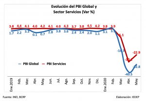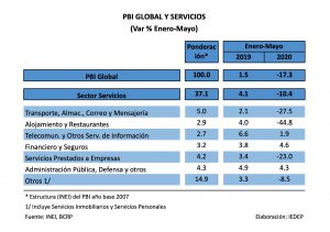 De acuerdo con el Instituto Nacional de Estadística e Informática (INEI), de enero a mayo el sector Servicios registró una variación de -10.4% en comparación con el similar periodo de 2019. Así, este sector decreció menos que el PBI total (-17,3%) en el mismo periodo de análisis.