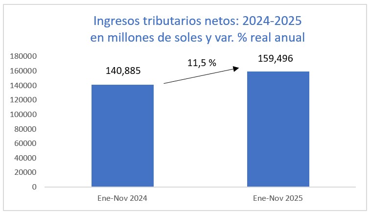 Los ingresos tributarios netos del gobierno central (descontando las devoluciones de impuestos) alcanzaron los S/ 159 496 millones entre enero y noviembre de 2025, cifra que representa un crecimiento acumulado de 11,5 % y de S/ 18 611 millones adicionales a lo registrado en el mismo periodo el año pasado. Asimismo, dicho monto ya ha superado a los S/ 155 756 millones recaudados durante todo el 2024.