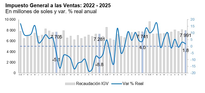 Impuesto General a las Ventas (IGV): La recaudación del IGV alcanzó S/ 7 991 millones en noviembre, importe que representó un incremento de 1,8 % frente al mismo mes de 2024.