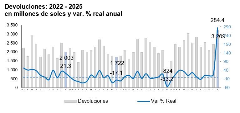 Devoluciones: Las devoluciones de impuestos realizadas en noviembre ascendieron a S/ 3 209 millones, importe que representó un crecimiento de 284,4 % en comparación con el mismo mes de 2024, influenciado por la emisión de Notas de Crédito Negociables.