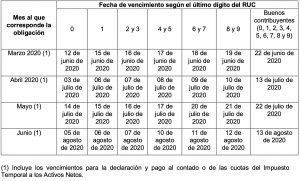 La declaración y pago de esos tributos mensuales se efectuará ahora entre los meses de junio y agosto, para dar mayor alivio tributario, facilidades y liquidez a los contribuyentes, y puedan hacer frente en mejores condiciones al impacto económico generado por la pandemia del coronavirus.