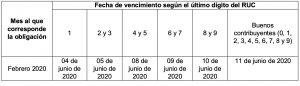 Solo para los contribuyentes con ingresos de hasta S/ 9 ́660,000, todas las declaraciones mensuales del mes de febrero son prorrogadas hasta el mes de junio, de acuerdo con el siguiente cronograma: