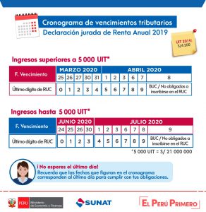 La Superintendencia Nacional de Aduanas y Administración Tributaria (Sunat) dispuso que las empresas y personas que obtuvieron ingresos netos de hasta 5 000 Unidades Impositivas Tributarias (UIT), equivalente a S/ 21 millones, también puedan aplazar por tres meses la Declaración Anual del Impuesto a la Renta 2019.