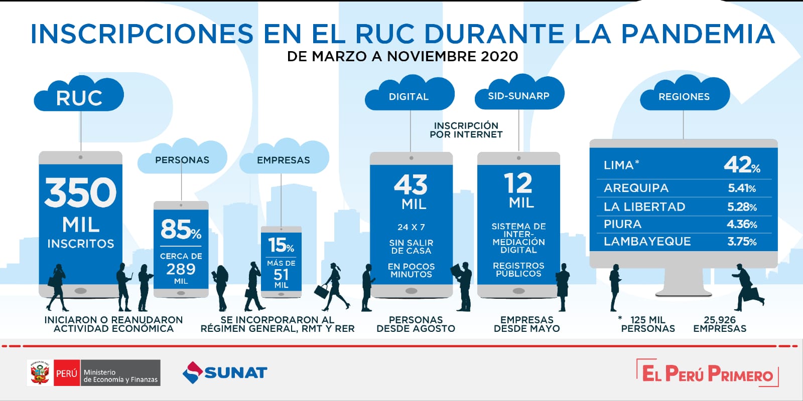En los último ocho meses, Lima concentra el 42% de los nuevos inscritos en el RUC. En este periodo se registraron en la capital más de 125 mil nuevos contribuyentes como Personas Naturales y 25,926 como empresas. Le siguen en número de inscritos Arequipa (5.41%), La Libertad (5.28%), Piura (4,36%), Lambayeque (3.75%), entre otros.