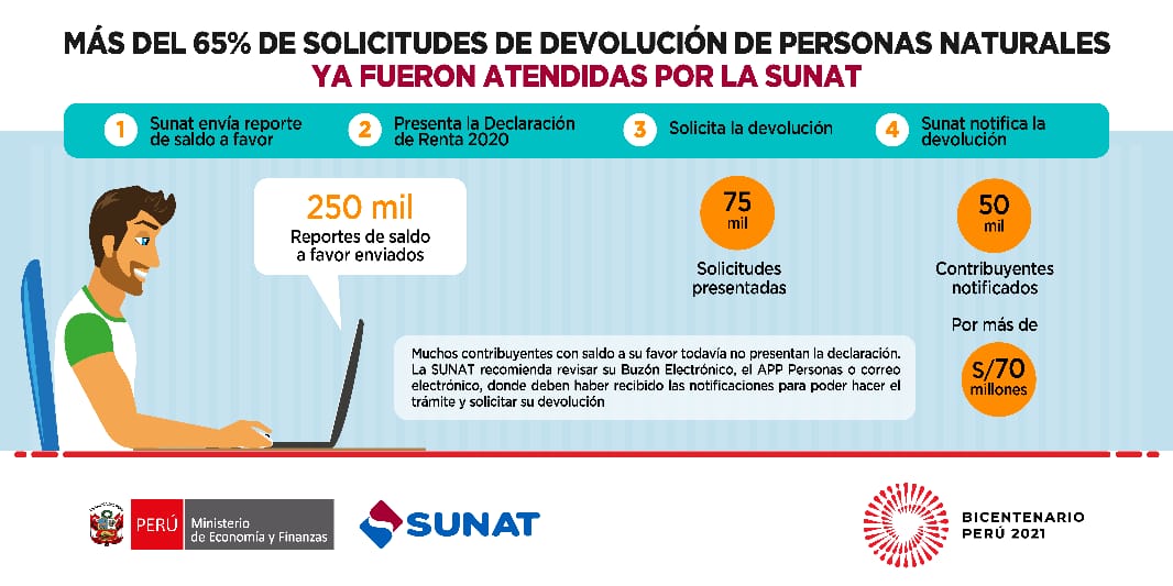 Como resultado de los esfuerzos para agilizar ese proceso, a la fecha, la Sunat ya notificó a unos 50 mil contribuyentes (personas naturales) la devolución por un monto cercano a los 70 millones de soles. Las alertas se comunican al Buzón Electrónico, disponible en www.sunat.gob.pe, a través del APP Personas o al correo electrónico previamente registrado.