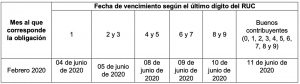 En el caso de la declaración mensual del mes de febrero, que en un primer momento había sido postergada hasta el mes de abril, solo para los contribuyentes con ingresos de hasta S/ 9 660 000, también es aplazada hasta el mes de junio, de acuerdo con el siguiente cronograma: