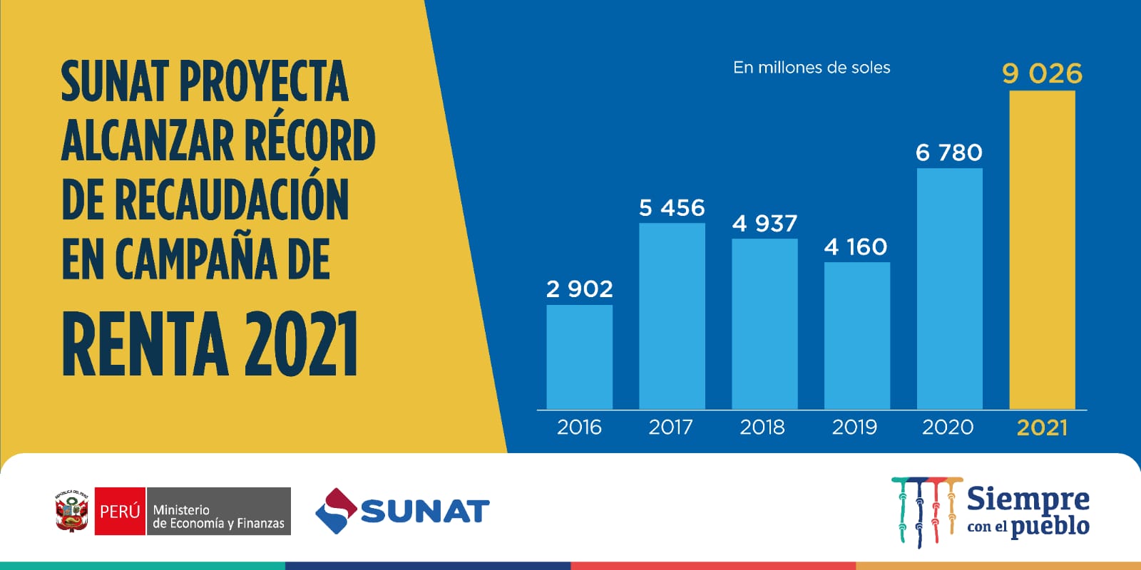 La Superintendencia Nacional de Aduanas y de Administración Tributaria (Sunat) proyecta alcanzar una cifra récord de recaudación durante la presente Campaña de Declaración Anual del Impuesto a la Renta 2021, con ingresos que se acercarían a los S/ 9.000 millones y un crecimiento que superaría en 20% lo obtenido en la campaña anterior.