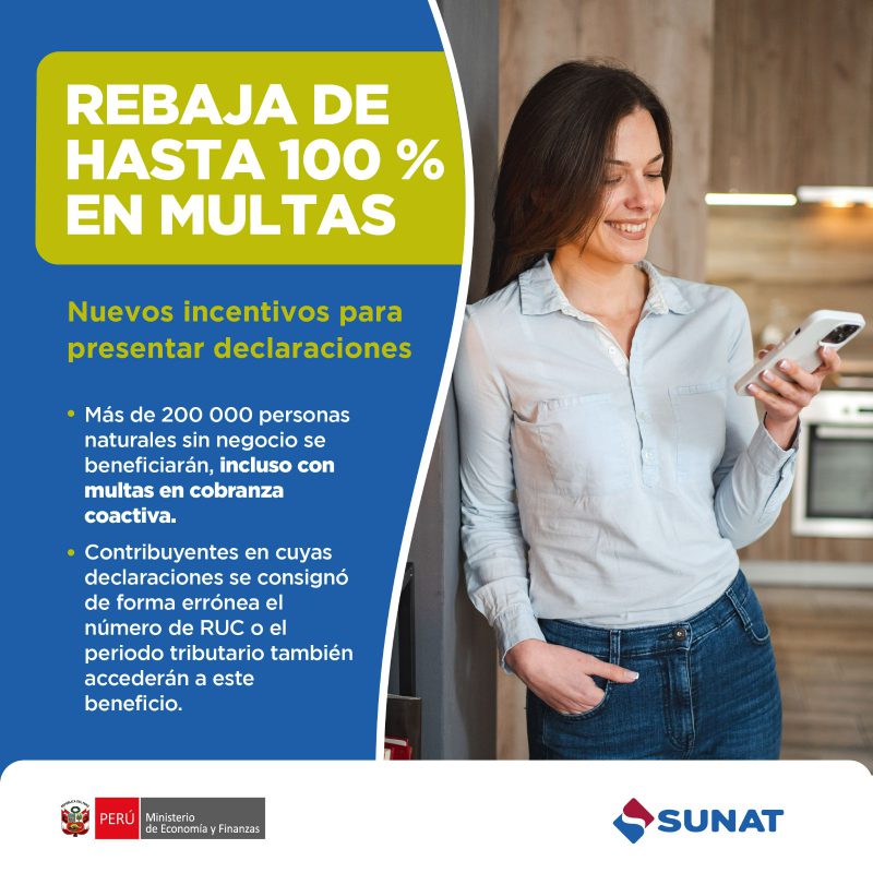 La Superintendencia Nacional de Aduanas y de Administración Tributaria (SUNAT) dispuso, mediante la Resolución de Superintendencia N° 355-2025, la rebaja de hasta el 100 % de las multas por no presentar declaraciones. El beneficio está dirigido a personas naturales sin negocio que omitieron presentar sus declaraciones mensuales o anuales, o cuyas declaraciones fueron consideradas “no presentadas” por consignar de forma errónea el número de RUC o el período tributario.