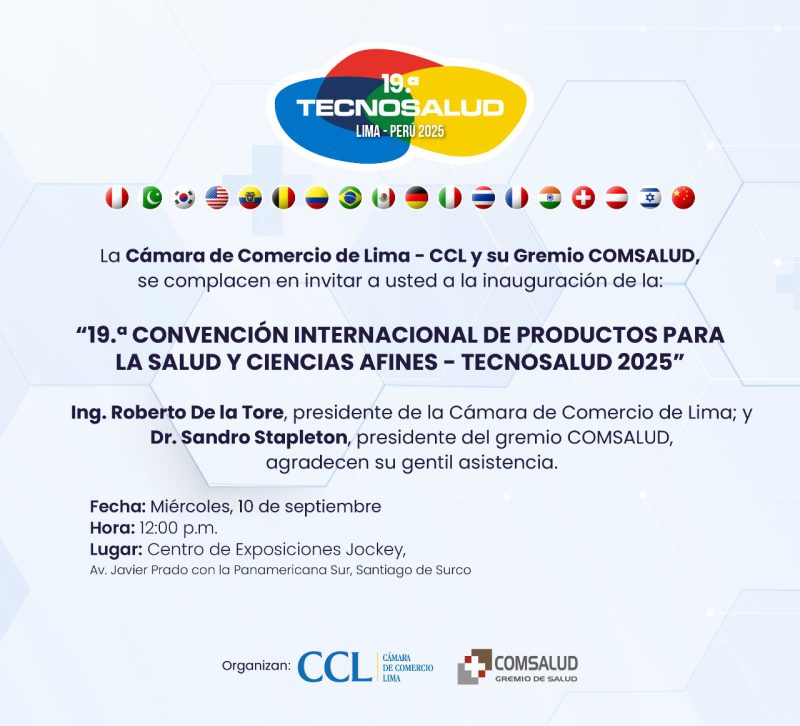 Lo último en tecnología médica, equipos e implementos médicos, así como las últimas tendencias en innovación digital e Inteligencia Artificial (IA) en salud, serán los atractivos de la “XIX edición de la Convención Internacional de Productos para la Salud y Ciencias Afines – TECNOSALUD 2025”, evento que realizará la Cámara de Comercio de Lima (CCL) y su Gremio de Salud del miércoles 10 al viernes 12 de setiembre en el Centro de Exposiciones Jockey.